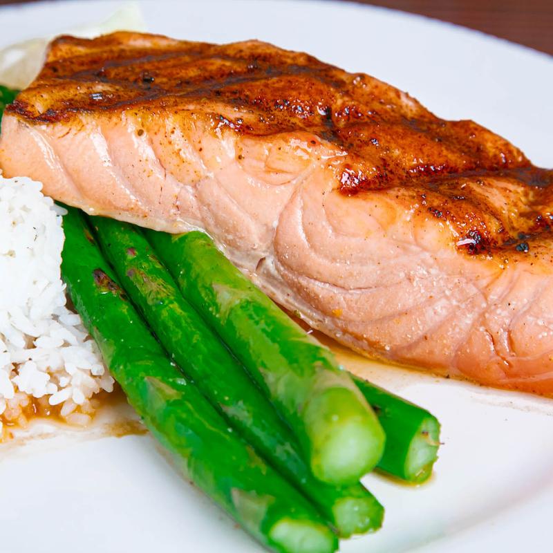 Fresh grilled salmon with a tequila agave glaze, baby heirloom tomato salsa, cilantro lime rice, and grilled asparagus