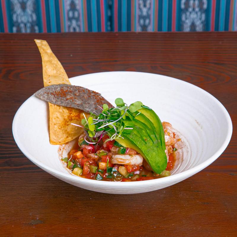 Pacific shrimp, pico de gallo, cucumber, diced jalapeno, fresh lime juice, and crispy chips